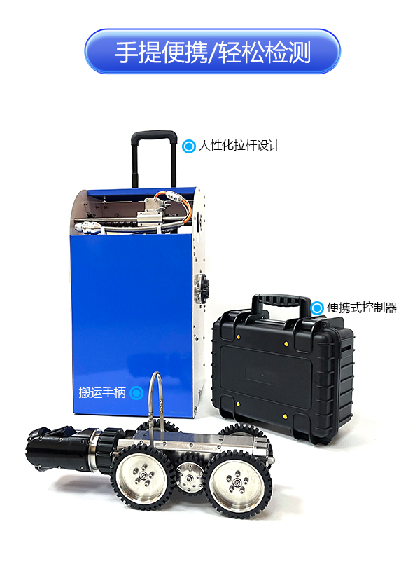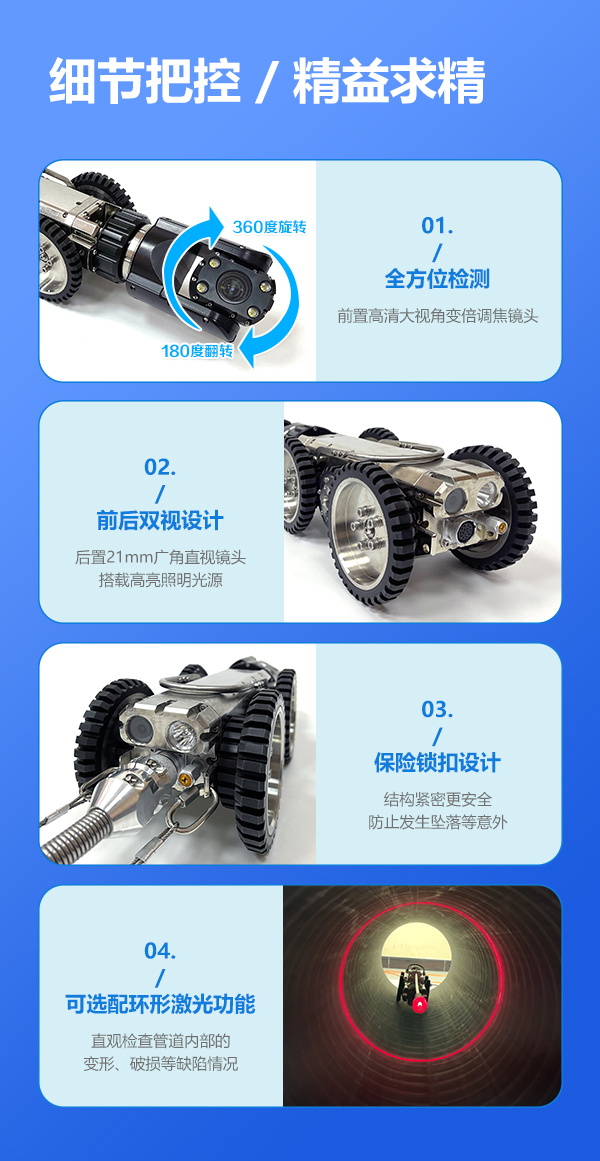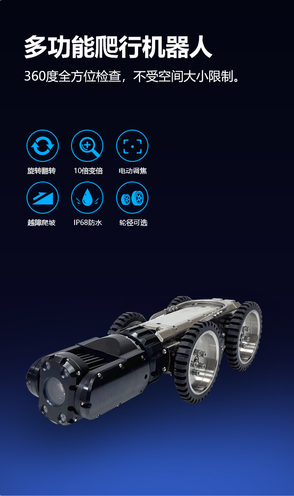 GTR120B系列工業(yè)管道檢測機器人是一款具備變倍功能的超清管道內(nèi)部檢測機器人,能夠代替人工進入 管道內(nèi)部,通過搖桿控制 爬行器的進退、轉(zhuǎn)彎以及鏡頭的旋轉(zhuǎn)、翻轉(zhuǎn),輕觸式按鍵進行變倍調(diào)焦、拍錄、回放等操作,為判斷提供及時、詳細的圖像物證。采用變倍調(diào)焦鏡頭,不受空間大小限制,200萬高清鏡頭,還原細節(jié),前后雙視設計,實施呈現(xiàn)倒車影像;搭載計米裝置,輔助判斷缺陷位置,中英文實時標注,及時記錄缺陷信息。產(chǎn)品適用于150mm~2000mm直徑的遠距離管道檢測,用于檢測管道內(nèi)部的裂紋、腐蝕、焊縫、異物等缺陷。